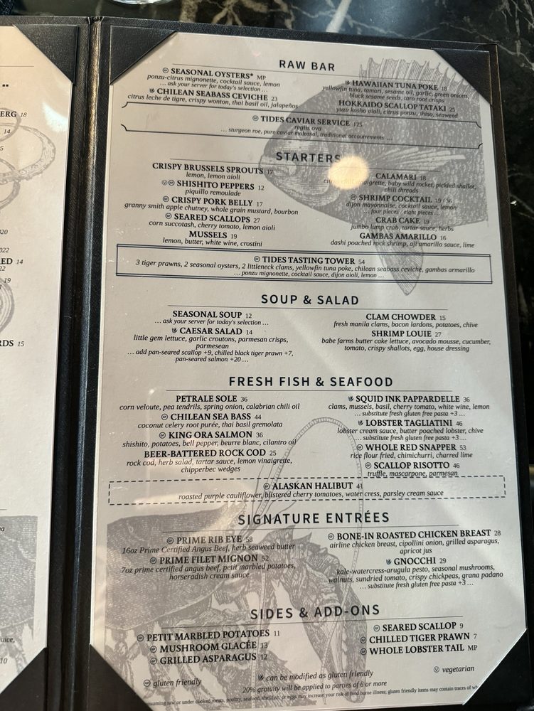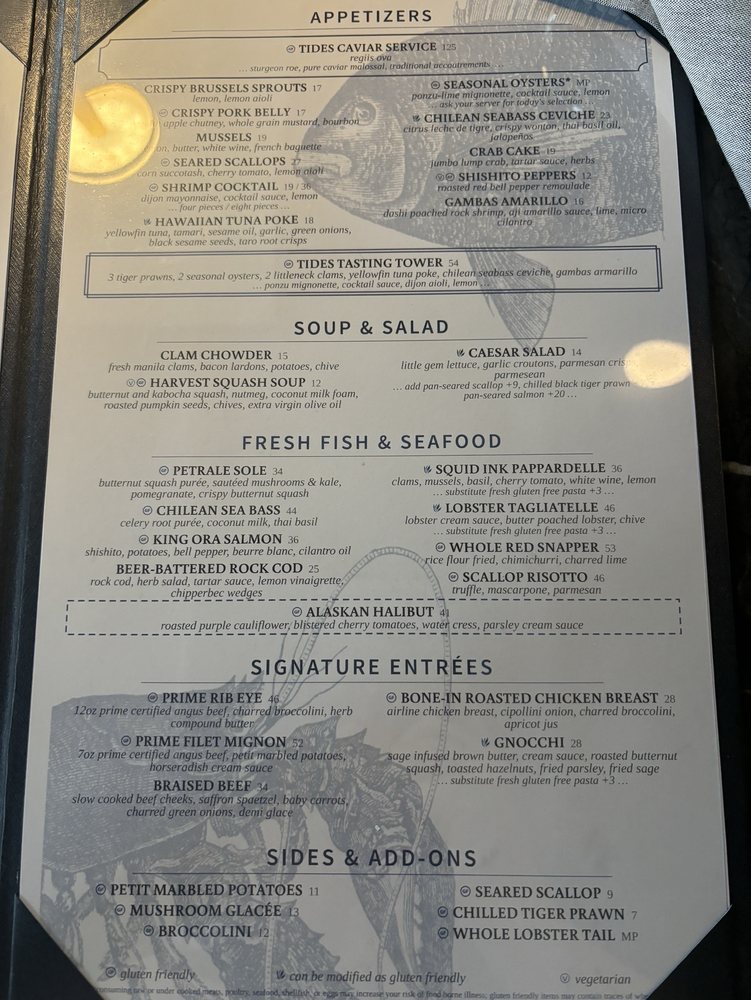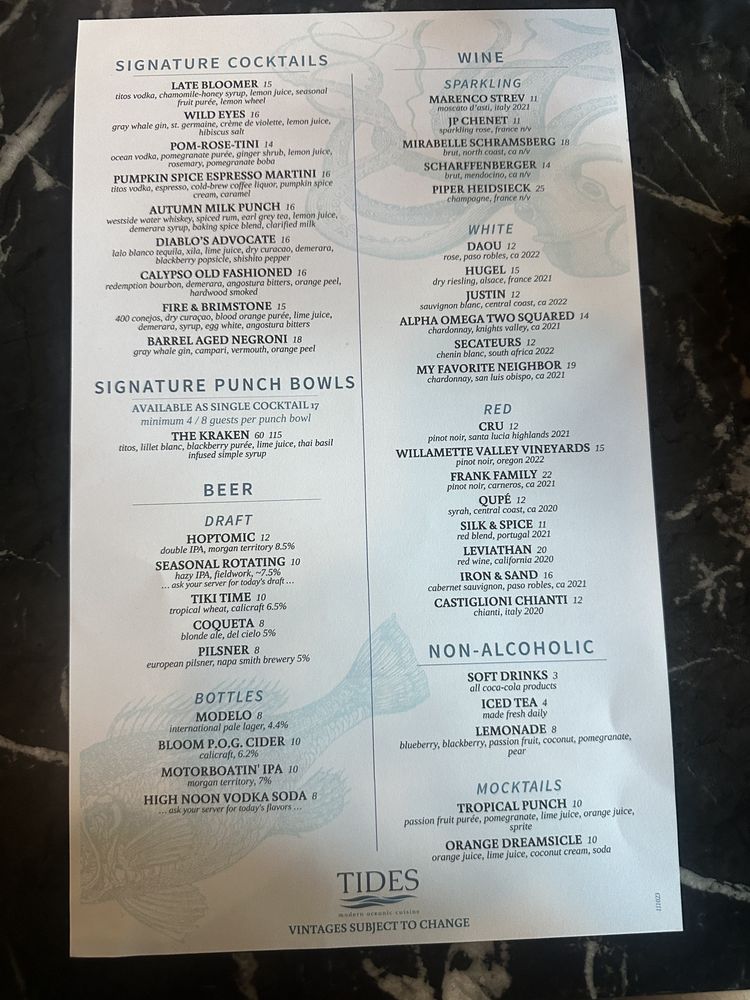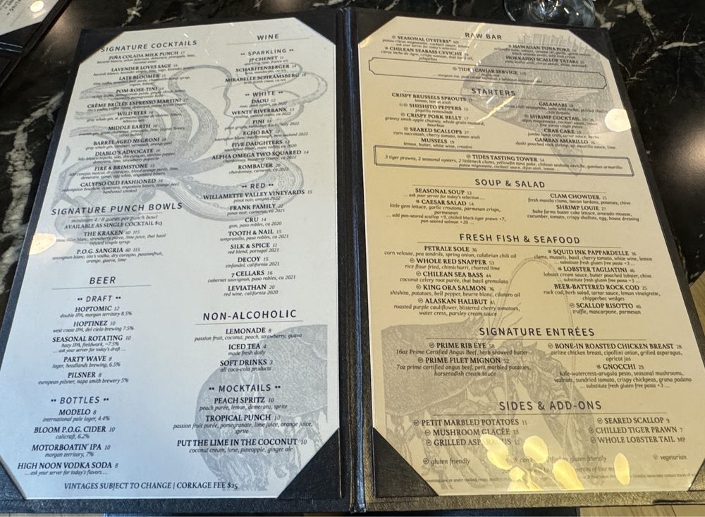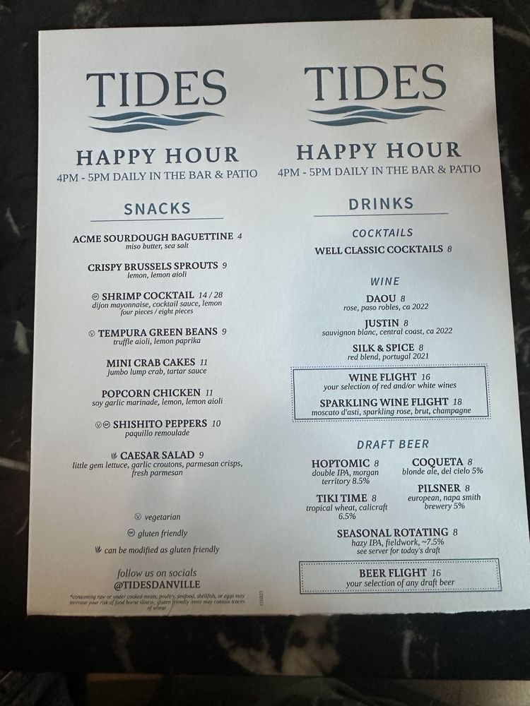 Tides in Danville offers a classy dining experience with a diverse menu of fresh seafood and creative cocktails. Customers rave about the flavorful dishes, particularly the oysters, calamari, lobster tagliatini, and sea bass ceviche. The happy hour menu is a hit, catering to all tastes with options like Miyagi oysters, shrimp cocktail, and clam chowder. The ambiance is perfect for a romantic date night, with attentive service and a range of seating options, including a charming outdoor patio. Tides also stands out for its sustainable practices, offering plastic-free packaging and reusable tableware. With rave reviews and a prime location, Tides is a must-visit destination for seafood lovers in the Bay Area.